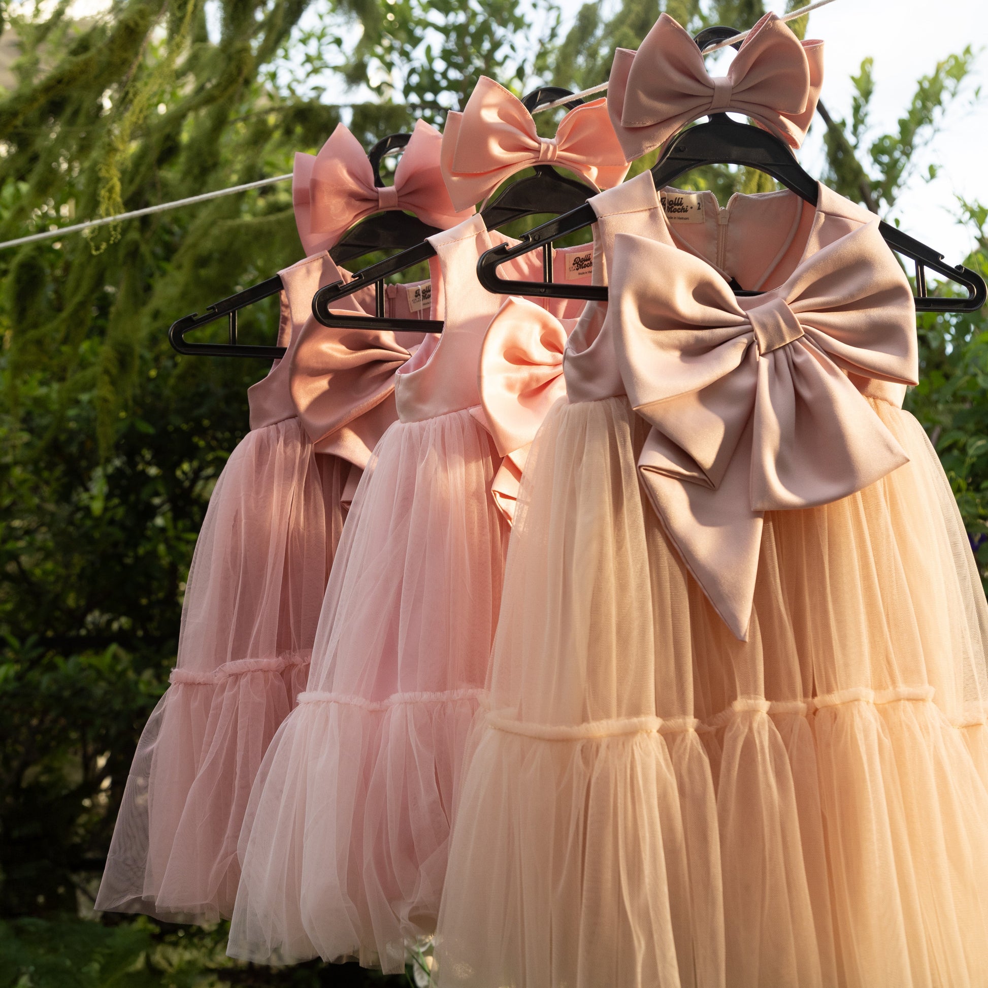 The Ella dress is the definition of less-is-more. With a sleek satin bodice and an oversized bow at the front, it balances simplicity with charm. The soft, gathered tulle skirt adds gentle volume, making it perfect for twirls without the fuss.