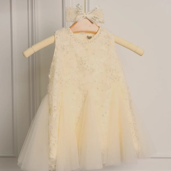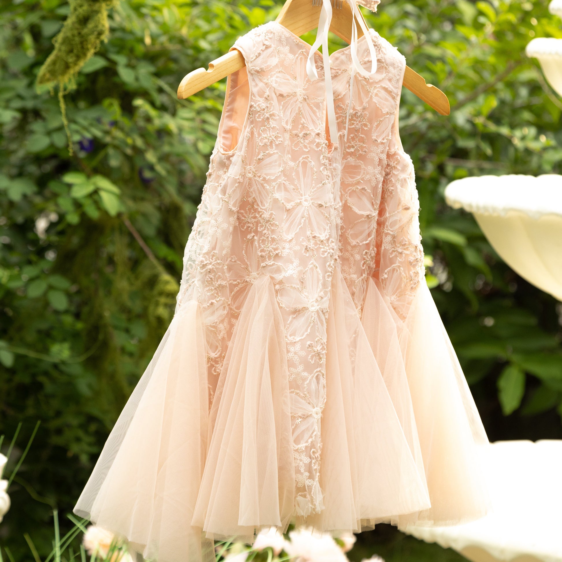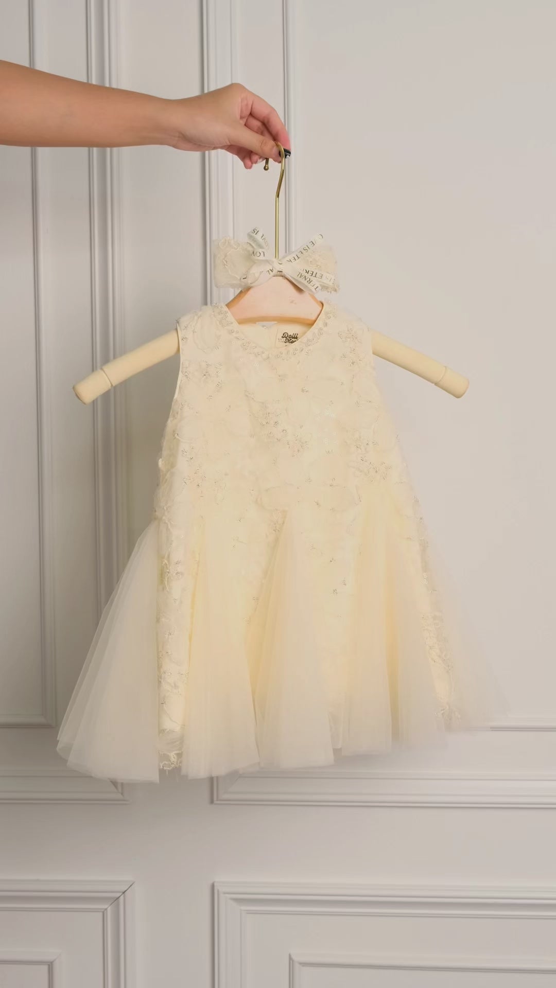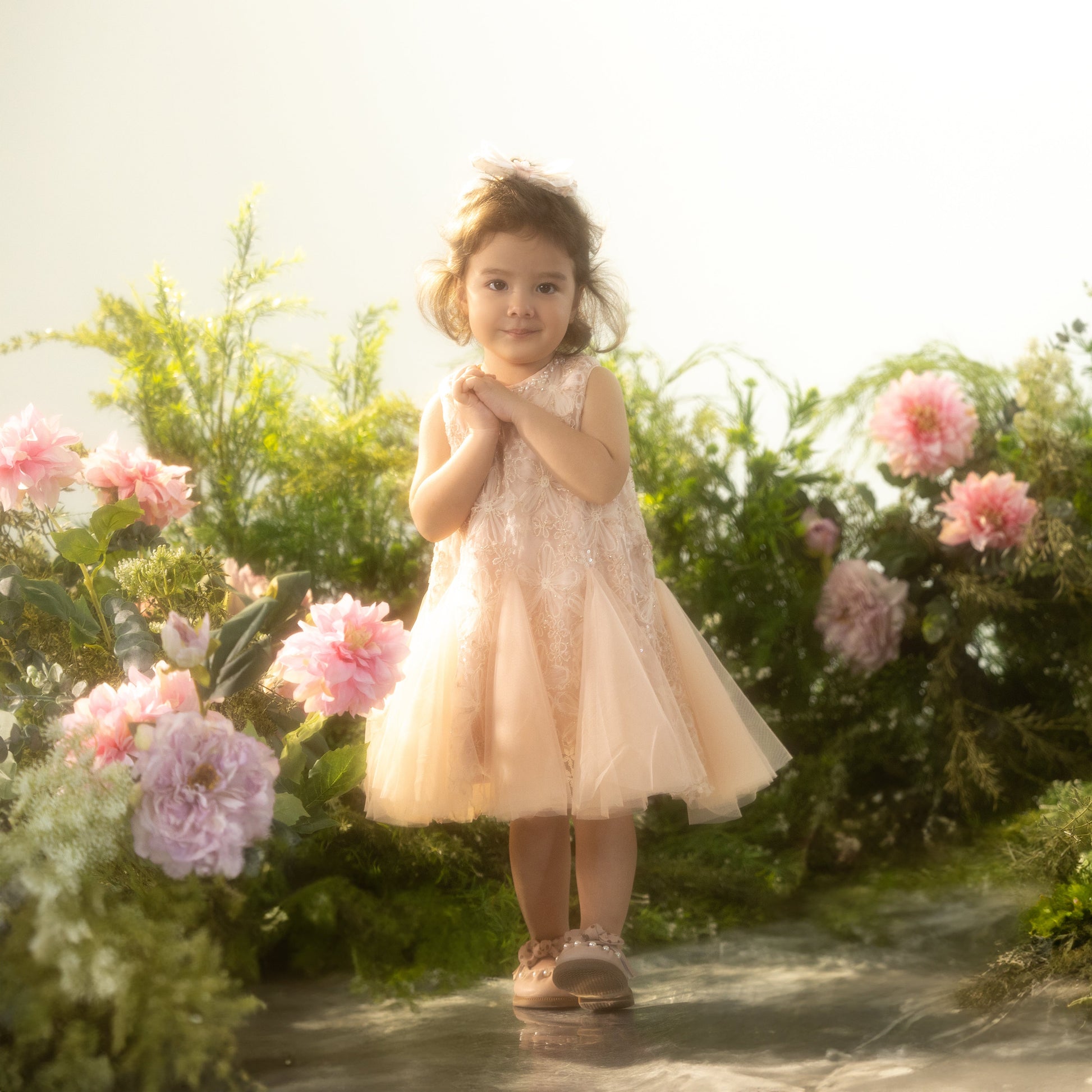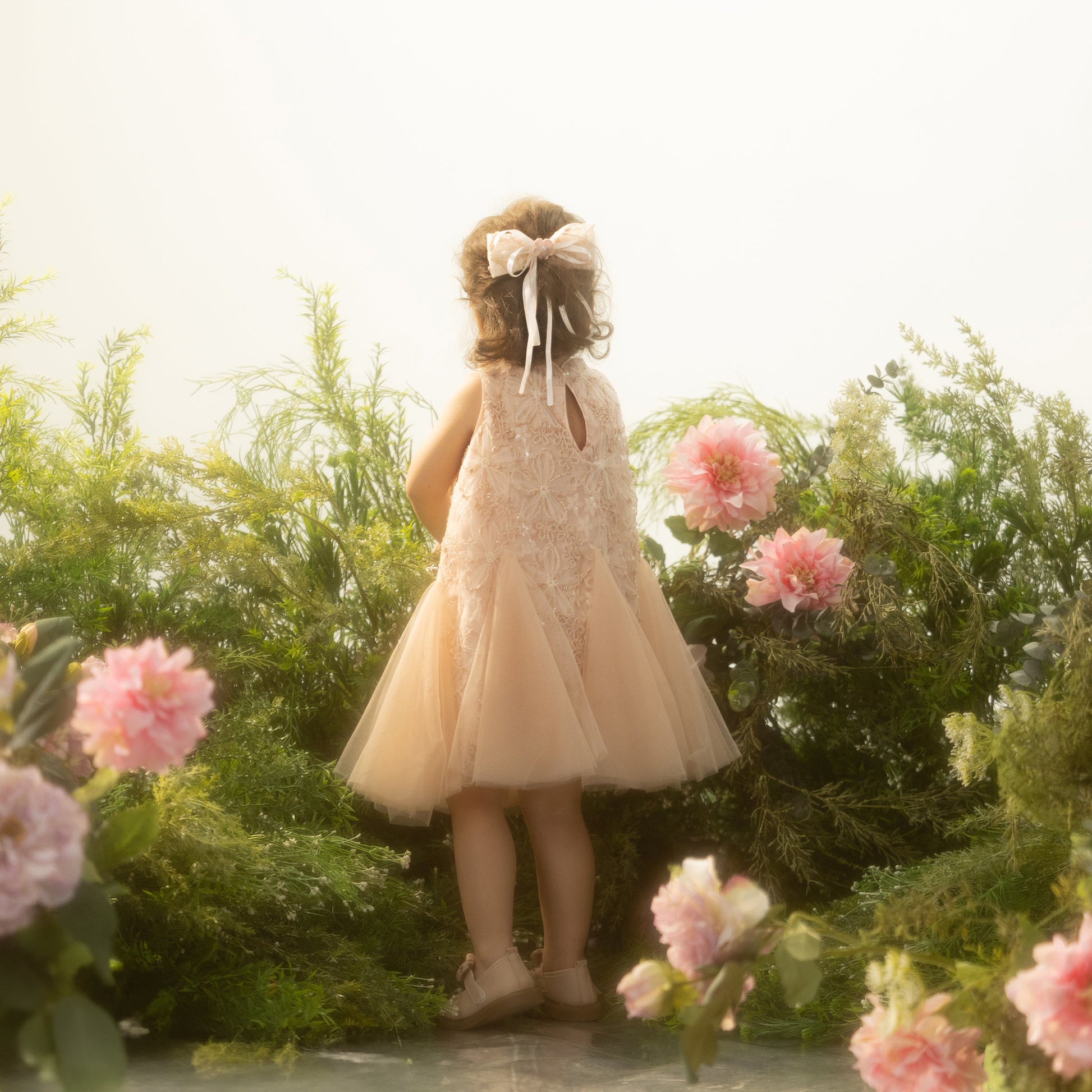 The Sofia dress brings refined beauty with soft floral lace embroidery and shimmering sequin accents. The pearl-trimmed collar adds a timeless touch, while the tulle detailing at the hem creates gentle volume and graceful movement—no bows needed.